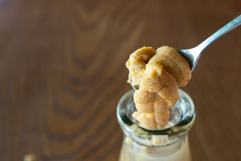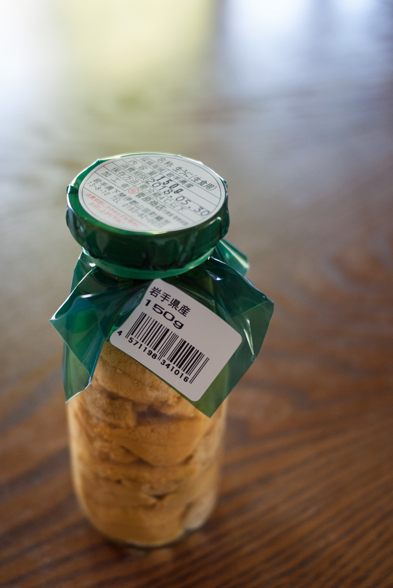 岩手三陸 山田町産 天然生ウニ 2018.05.26 山田町産 天然生ウニ 今年もいよいよ入荷しはじめました。岩手三陸産の天然生ウニ(キタムラサキウニ)です。今回はビン入で、15個以上のイガウニ(殻付きウニ)からとれる大変高価なものです。通称ビンウニは本来の風味がほとんど損なわれないので、とてもおいしいく頂くことができます。HAIKARA-YAでは夏の終わり頃まで様々な料理に使用します。