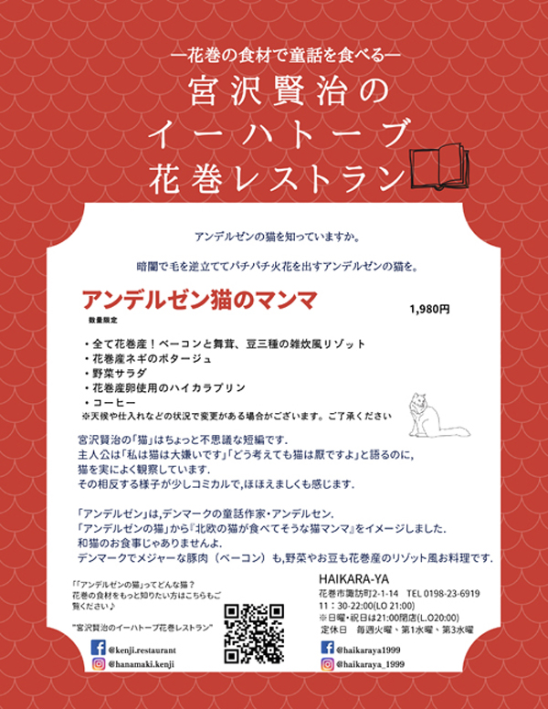 季節メニュー 宮沢賢治のイーハトーブ花巻レストラン2021.09.26 新型コロナの影響で行うことができなくなっていたイベント「宮沢賢治のイーハトーブ花巻レストラン」に参加しています。 当店では猫という童話をモチーフに「アンデルゼン猫のマンマ」というお題のメニューを考えました。 花巻の食材をできるだけ使用して、食材を活かすように優しい味に仕上げています。機会がありましたら是非お試しください。 今回の企画は花巻市の新垣さんと宮沢賢治の研究者でいらっしゃる中野さんお二人のお力で行うことができたと思います。ありがとうございました。
