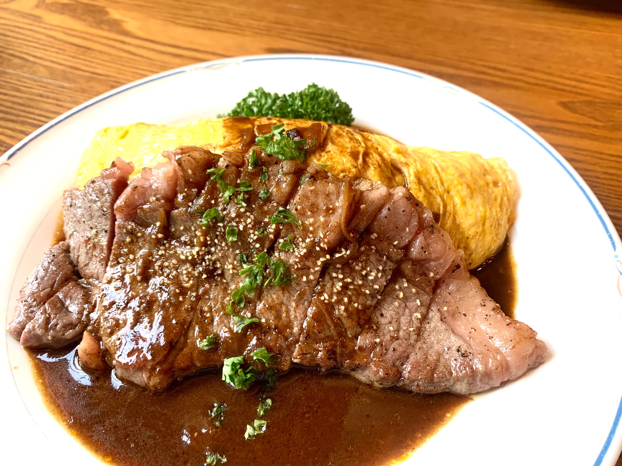 「オムライスカレーソース」とステーキをのせた「オムステーキカレーソース」とございます。