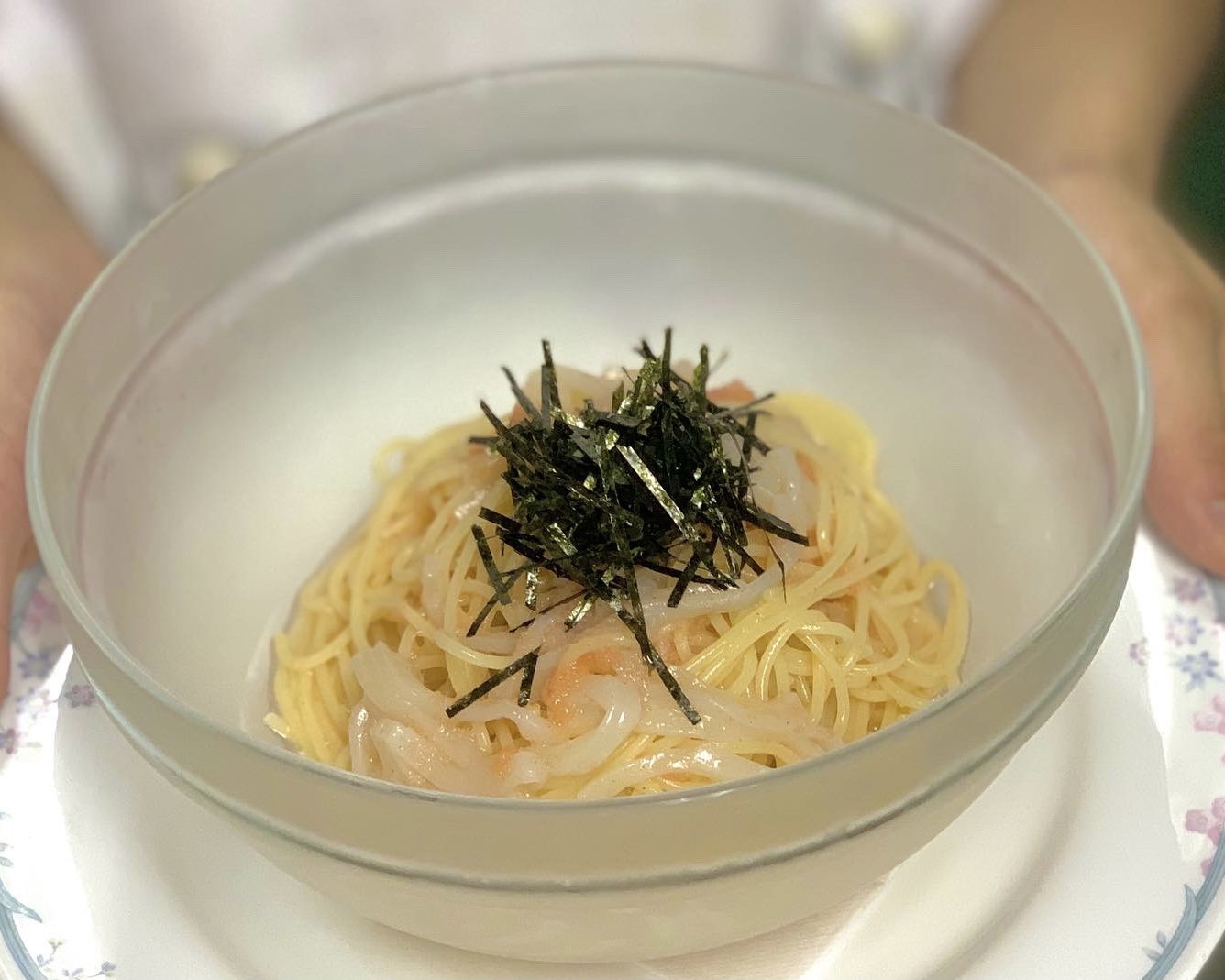 季節メニュー 冷製生イカと辛子明太子のスパゲティ