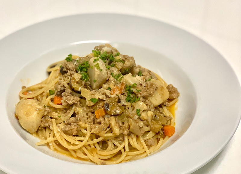 季節メニュー 白金豚と季節の味覚のボロネーズ2021.10.14 岩手県主催の県南地域限定「旬彩ごほうびフェア2021」に参加しています。 当店では花巻の名豚「白金豚」をベースに県南地域で採れた野菜をふんだんに入れたボロネーズソースを使ったスパゲティをご用意しています。 ぜひお試しください!