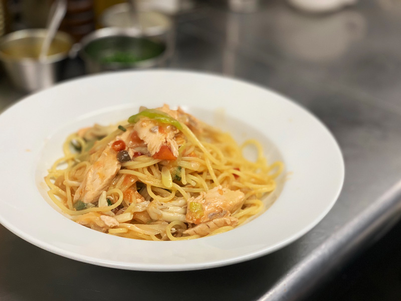 季節メニュー 花巻産曲がりネギと三陸真鱒のスパゲティ 2019.03.30 花巻産曲がりネギと三陸真鱒のスパゲティ 花巻、矢沢地区の曲がりネギです。甘みと香りが程よいとてもおいしいネギです。このネギ香りをオリーブオイルにじっくり移し調理します。今年豊漁の宮古市近海で獲れる真鱒と合わせてみました。 ネギとトマトの相性はとても良いと思います。ぜひご家庭でもお試しください。