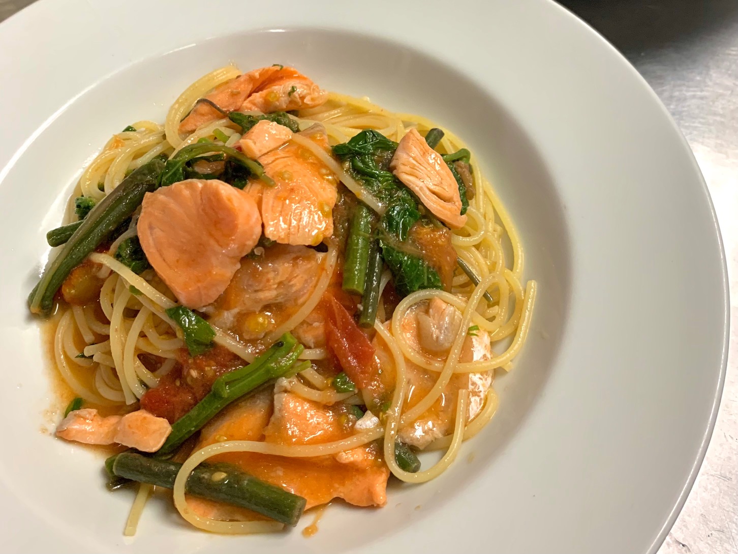 旬な食材 岩手産しどけ(山菜) 個人的にも大好きな山菜「しどけ」です。 岩手県の山々は、天然のとてもおいしい山菜が豊富に採れます。 乱獲せずに後々まで資源を残したいですね。 岩手三陸宮古市のレアに火入れしたトラウトサーモンと合わせてスパゲティに。