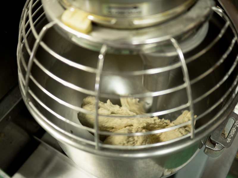 まず水にビール酵母、砂糖を混ぜ、小麦粉を数回に分けながらミキサーで撹拌します。その後塩を投入して30分ほど捏ねます。機械を使っているとはいえ、パン生地と違い捏ねてる間は生地がとても固いのでマメに手を加えてしっかりと捏ねます。ミキサーやホームベーカリー器などがない場合、ボールで手で捏ねてもなんとか大丈夫です。それはこの後の発酵に理由があります。