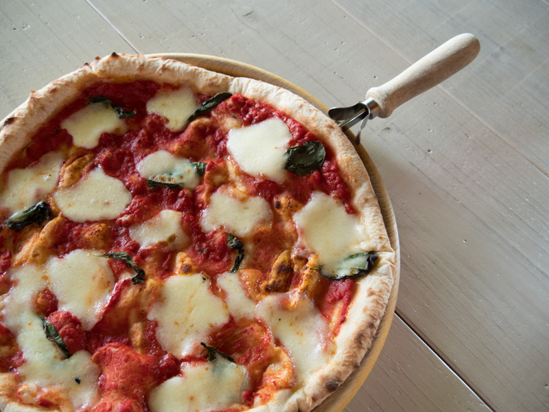 あとは注文を受けたら冷蔵庫から取り出し生地を伸ばしてソースを塗り、食材を載せて窯で焼き上げるだけ。ちなみに伸したピザ生地を空中に放り投げるシーンがテレビ等でたまに見受けられますが、単なるパフォーマンスというだけではありません。生地を伸ばした時に使った、余分な打ち粉を払うという意味があります。