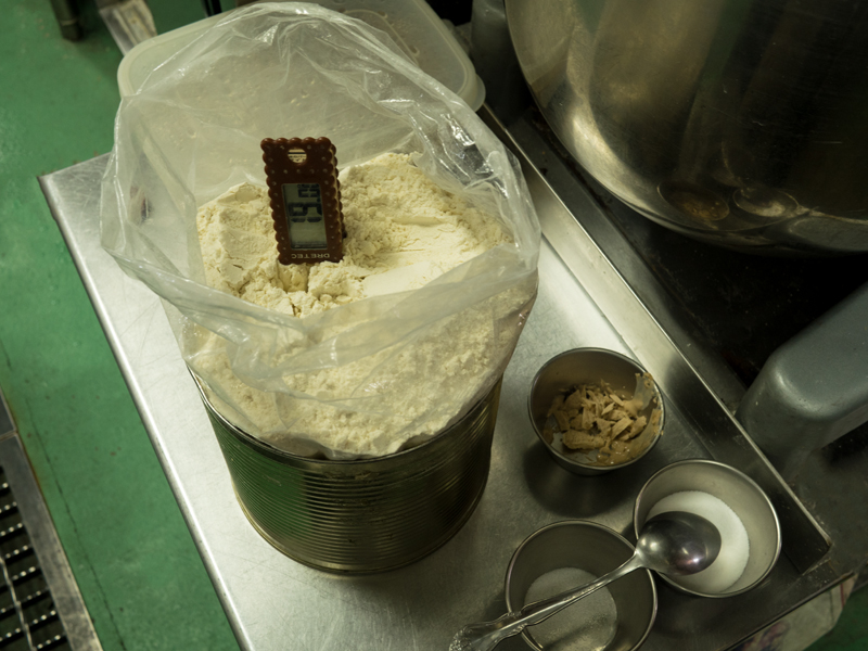 室内の温度と湿度、粉の温度を測り、その日の仕込み分の水量と水の温度、塩の量を決めます。ベースとなるのは小麦粉1.8kgに対して、水1リットル、砂糖1.5g、塩45g、そして酵母としてビール酵母7gを使用します。だいぶ前になりますが酵母は生イーストを使っていました。ある業者さんにこのビール酵母を紹介されて使ってみたところ焼き上がり方が穏やかで、食感はしっとり、中はもっちりと焼き上げることができたんです。イーストより重厚な仕上がりでしたね。気に入ってそれ以降ビール酵母を使っています。ビール酵母は100%天然素材。ビールを発酵させるための酵母であってアルコールはもちろん含まれていません。身体にも良いと言われていますしね。ご家庭ではビール酵母は手に入りにくいのでスーパーなどで見かけるドライイーストでもぜんぜん大丈夫です。