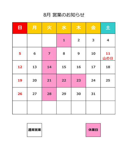 8月の営業カレンダー