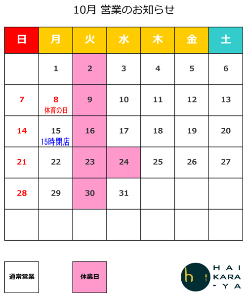 10月のお知らせです。またまた三連休がありますねー。ここ数年10月が最も秋らしくて過ごしやすい日が多くなったような気もします。
