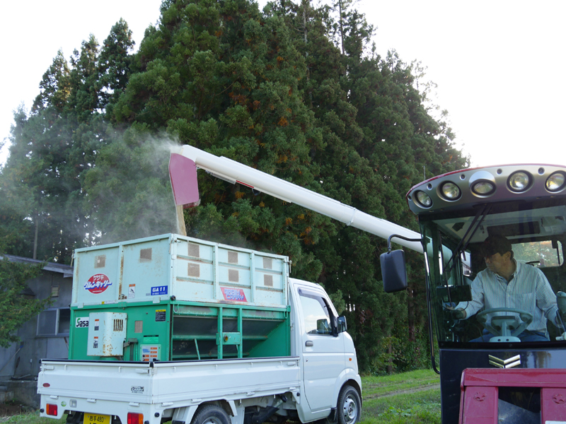 驚くほどのスピードであっという間に刈り取りも終わり、「収穫・脱穀・選別」を一度にこなすコンバインから籾を軽トラックのタンクへ移します。