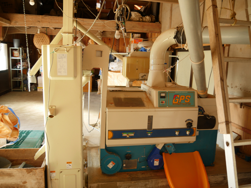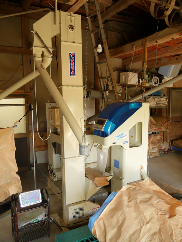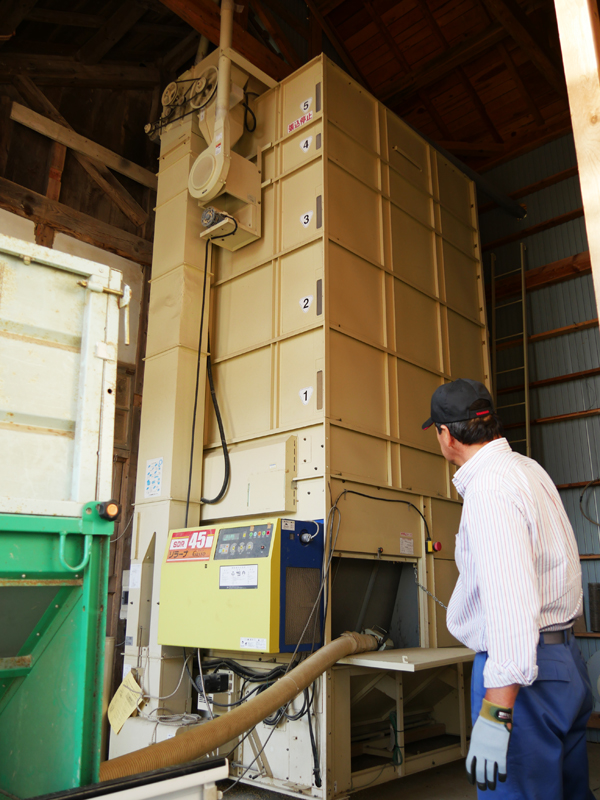 この大きな機器は乾燥機。今回収穫のお米は15年間休耕していた田んぼでの作付けだったために、稲穂が熟すタイミングを見計らい少し遅らせて刈り取ったのだそうです。ですから乾燥は自然にある程度進んでいて、玄米の水分量が出荷基準の15.3%に達するのに6時間で済むのだそうです。水分が多い時は12時間もの時間を要するそうですよ。