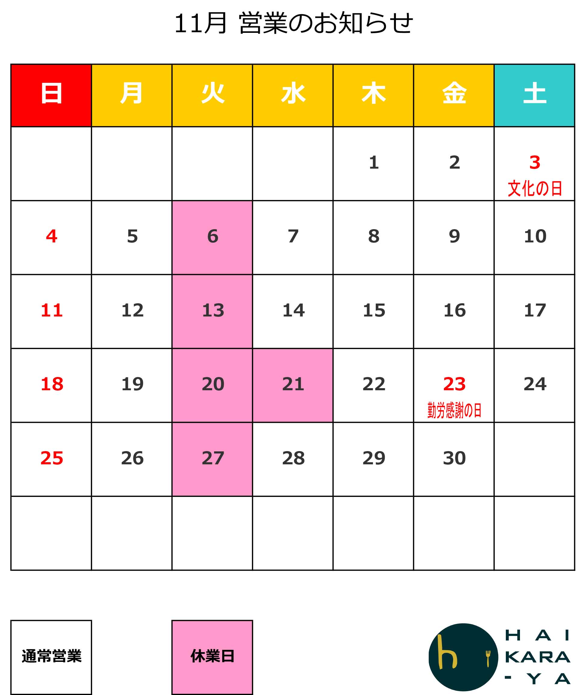 HAIKARA-YA 11月の営業日をお知らせします。
