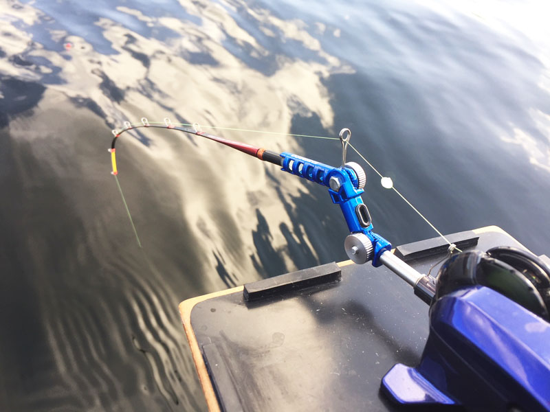 ポイントへ到着しましたら湖面にロープが張ってあるのでそれにスワンをくくり付けて釣りをするというスタイルとなっています。