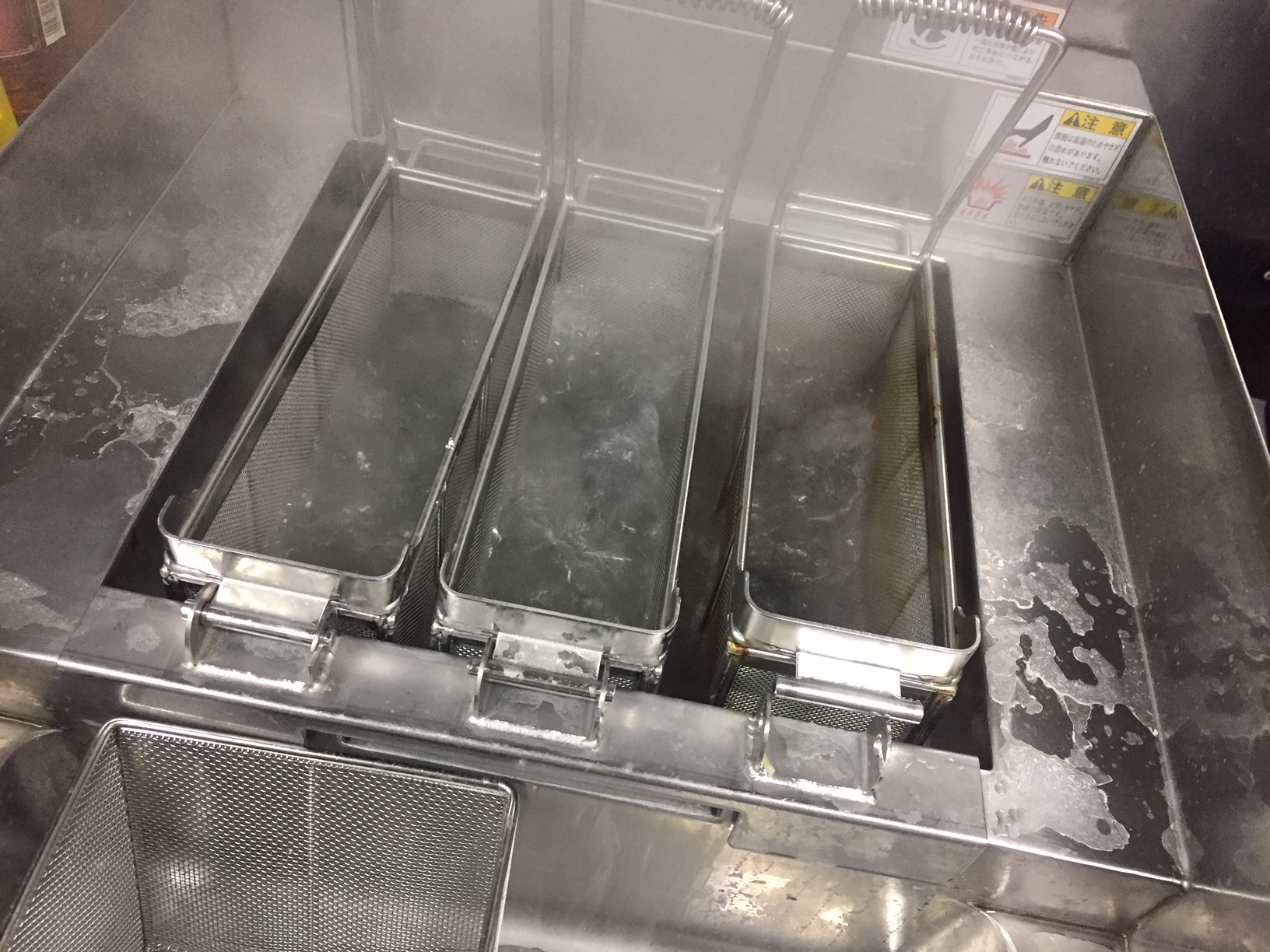 当店ではこの様な機器でスパゲティをボイルしています。茹で上げた後の時間を短縮するためにあれこれ工夫しおよそ5秒単位で茹で時間を調整しています。