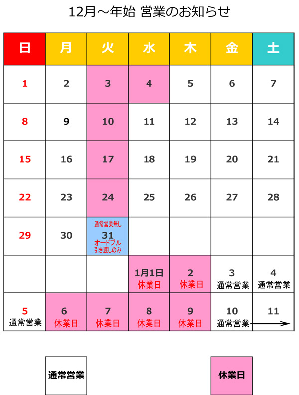12月~年始の営業日のお知らせ 2019年11月24日 12月から年始にかけての営業日をお知らせいたします。 12月31日は、昨年までランチタイム営業後のオードブルお引き渡しでしたが、今年から終日『オードブルお引き渡しのみ』の営業とさせていただきます。 またお正月は、3(金)、4(土)、5(日)を営業日とさせて頂きます。 その他につきましては下記カレンダーをご覧ください。どうぞよろしくお願いいたします。