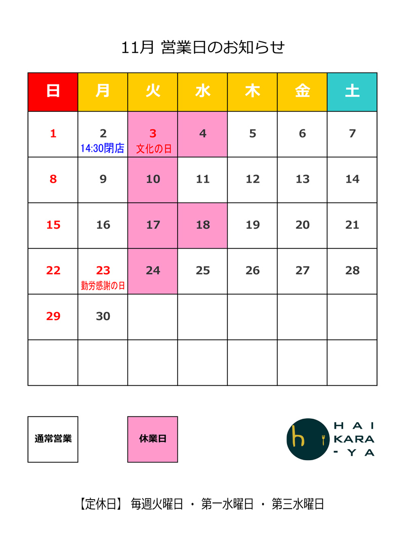 11月の営業日をお知らせいたします。