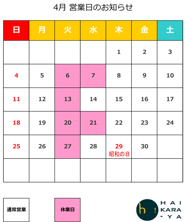 4月営業日のお知らせ 2021年4月1日 だいぶ暖かくなってきました! 岩手県内でも沿岸地方からサクラの開花が聞こえてきましたが、花巻はもうちょっと先ですね。 今月の営業日をお知らせします。 【休業日:毎週火曜、第1水曜・第3水曜】
