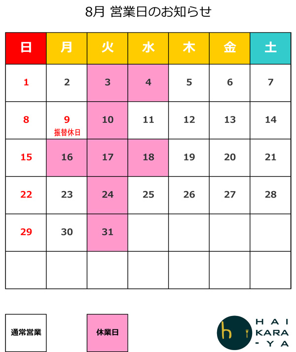8月営業日のお知らせ