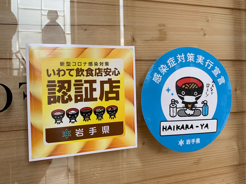 新型コロナ感染対策として、岩手県から飲食店へより厳格な基準が示されましたのでそれに準じて対策し、2021年8月8日「いわて安心飲食店認証店」と認められました。