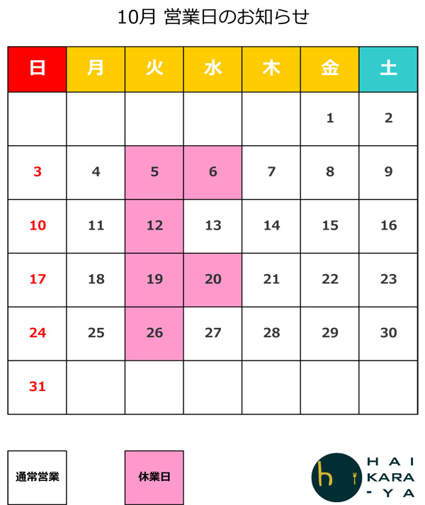 毎週火曜、第一水曜、第三水曜は定休日です。