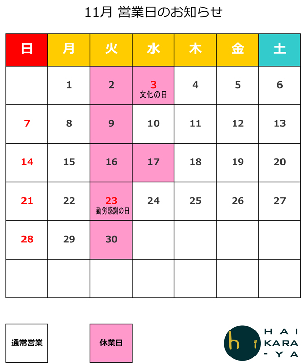 11月の営業カレンダーです。